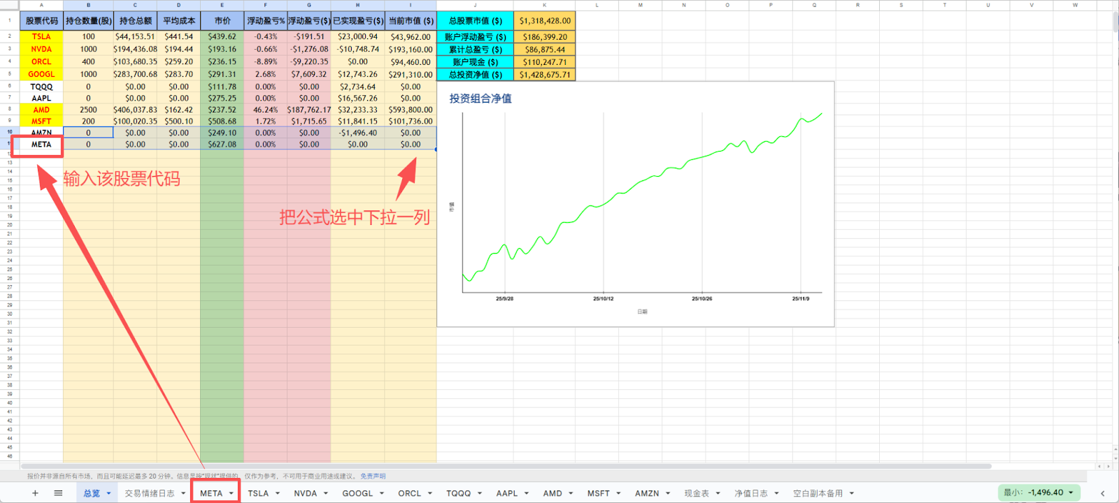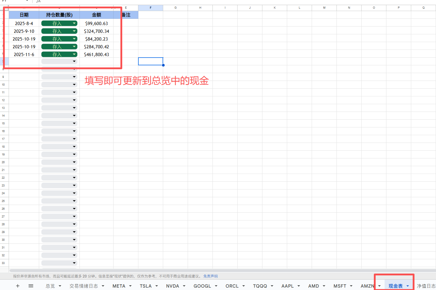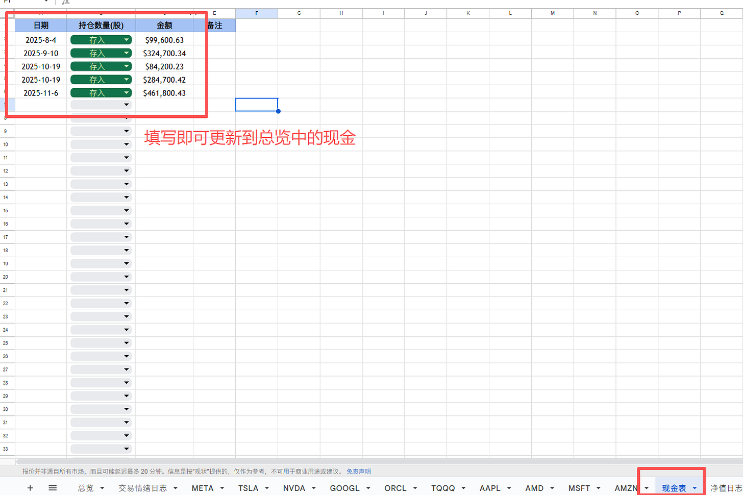 这部分会自动同步到【总览】中的【账户现金 ($)】中,有了这个数据【总投资净值】也会计算得出。