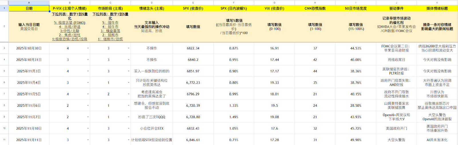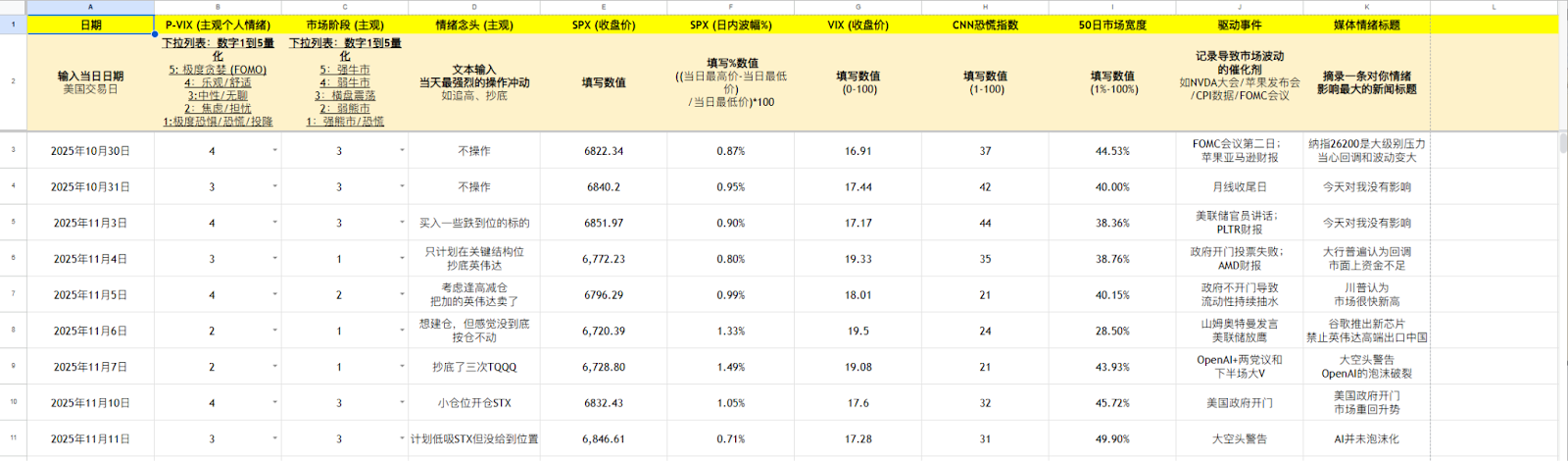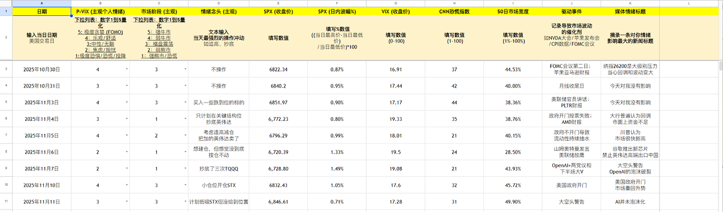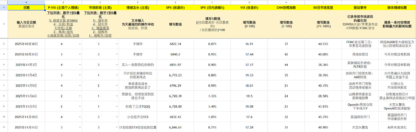 记录你的【主观判断】:P-VIX 个人情绪打分, 市场阶段, 情绪念头。