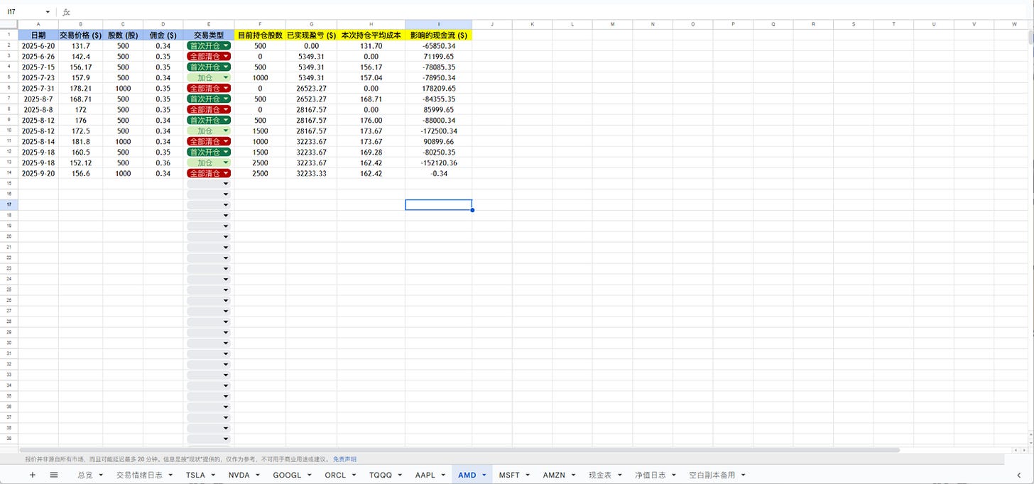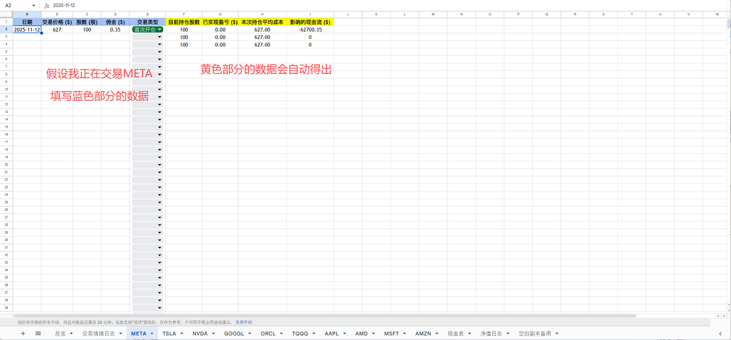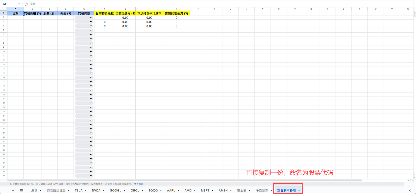 这是一套用于跟踪和复盘IBKR股票交易的电子表格系统。我分离了账户总览、个股明细和情绪日志,帮助你详细记录每一笔操作并分析决策。以下是使用教程。